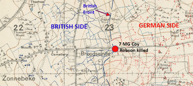 Enduring continual rain, flooded trenches and heavy shelling many of the battalion's platoons dwindled. It was always snowing, wet and the visibility was bad. On the 13th October, both sides were engaged in collecting wounded and refrained from shooting at stretcher bearers as they struggled in the mud and slush. That day Lt Col Heron wrote in his war diary "the men are very knocked up owing to privations and only by encouragement prevented from going sick". He said that "Feet, in spite of all precautions, in a bad way owing to wet weather". The following day - the 14th October - a shell struck Roy Wilson while he was on the slope leading down to Ravebeek River.