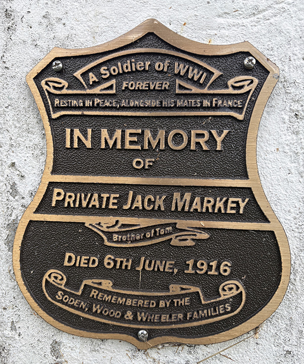 Pt Thomas Markey (Reg. No. 1713, 25th Bn) was killed in action on 14 November 1916 at Bapaume, France, and buried at the Warlencourt New British Cemetery. He was 36 years old, born in Ireland, and had already suffered gunshot wounds a few months earlier. Markey enlisted in Brisbane and it would seem logical that he be honoured along with the other war dead in Honour Avenue. It would seem that address at the time of enlistment was Carl Street, Thompson Estate, South Brisbane which would entitle him to be included with the Honour Avenue names. However, Carl Street is sometimes considered to be part of Wooloongabba and outside of Stephens Shire, this disqualifying him from the memorial. His father had a postal address of Ipswich Rd Annerley but there was much confusion about who was his next of kin.