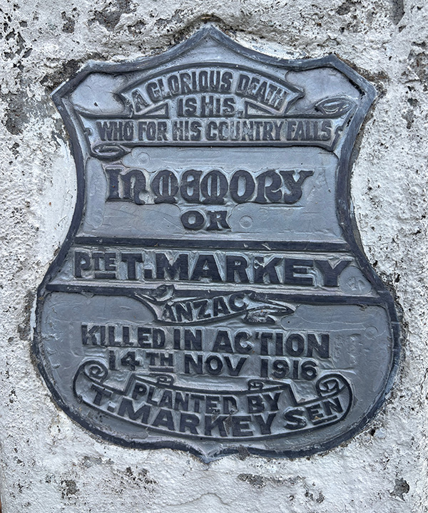 This memorial to Pte Thomas Markey was erected by his father Thomas Markey Snr, on the School Road side of the park, now outside the Country Womens Association Hall as can be seen in the leftmost photo. |